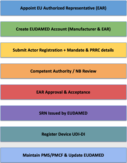 The first and mandatory step for a non-EU manufacturer is Actor Registration, which leads to the issuance of a Single Registration Number (SRN). This SRN is essential for device registration, Notified Body submissions, and communication with authorities.